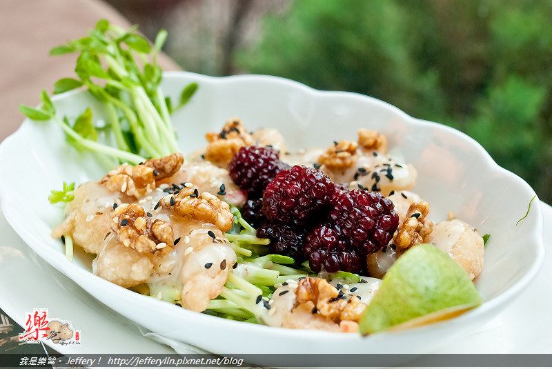 再者, 若是配上底下的覆盆子及一些淋上覆盆子汁的生菜, 整個味道很清爽, 剛好與油炸的蝦球形成對比, 那酸酸甜甜, 清清爽爽的滋味, 正應該是讓那蝦球吃起來不致於太油膩的原因之一吧?