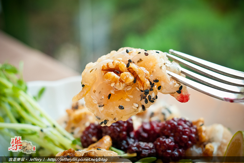 樂爸還蠻喜歡這道餐的滋味, 首先就有八隻飽滿的蝦球, 上面各有一顆核桃, 吃起來不油不膩, 蝦球很Q彈, 配上核桃不論是口感及滋味都令人口齒留香。