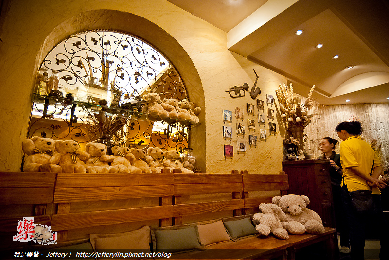 剛進大門, 一旁擺設著一排長木椅, 供排隊的客人休息所用, 週圍還用了許多小熊來加以點綴, 很可愛, (如上圖)。