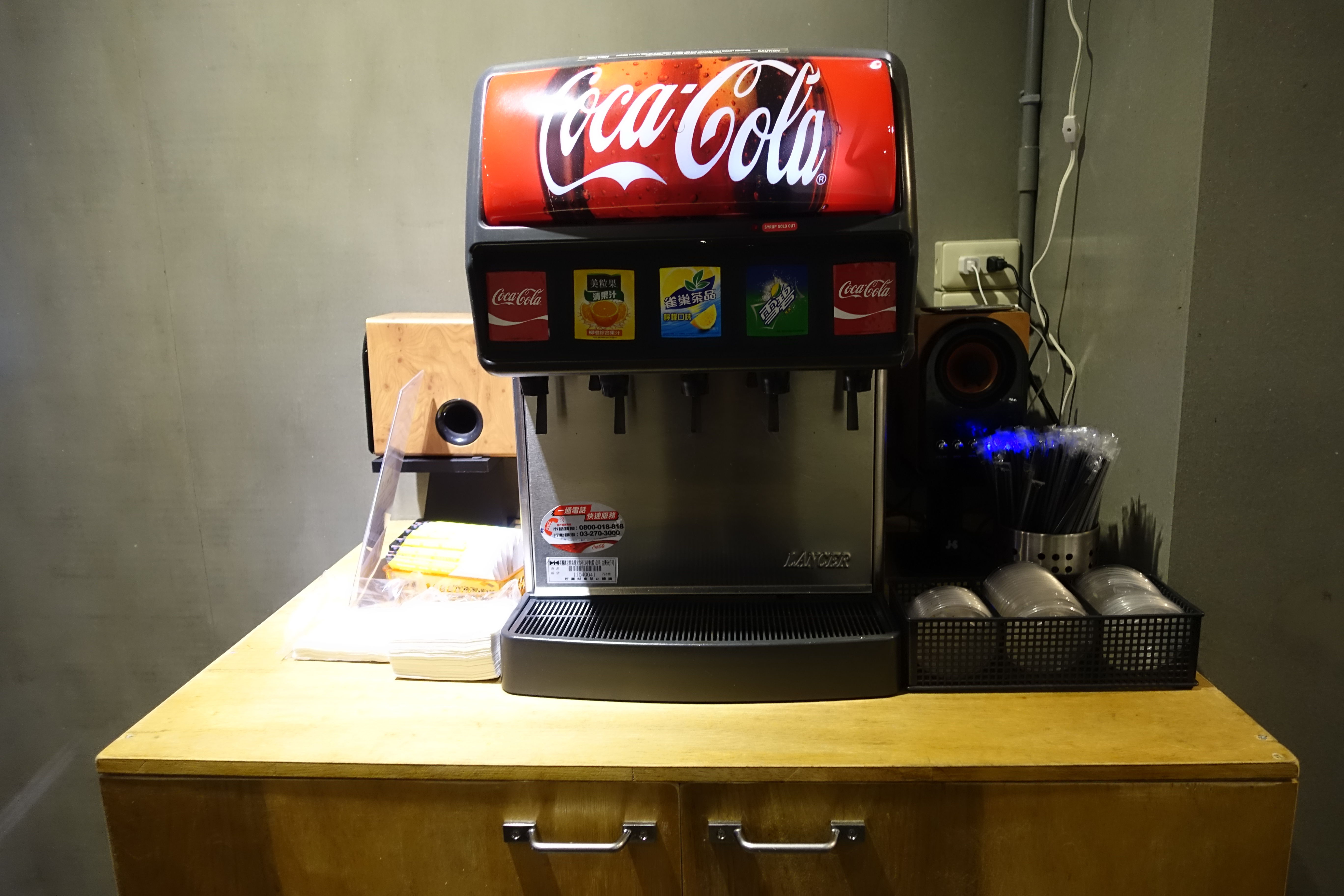 店內的空間不算大,總共只有三張長桌,背對背坐的話空間會有些許的狹窄。飲料的話是喝到飽的哦,付完錢之後老闆會給你杯子,可以自行去裝取。
