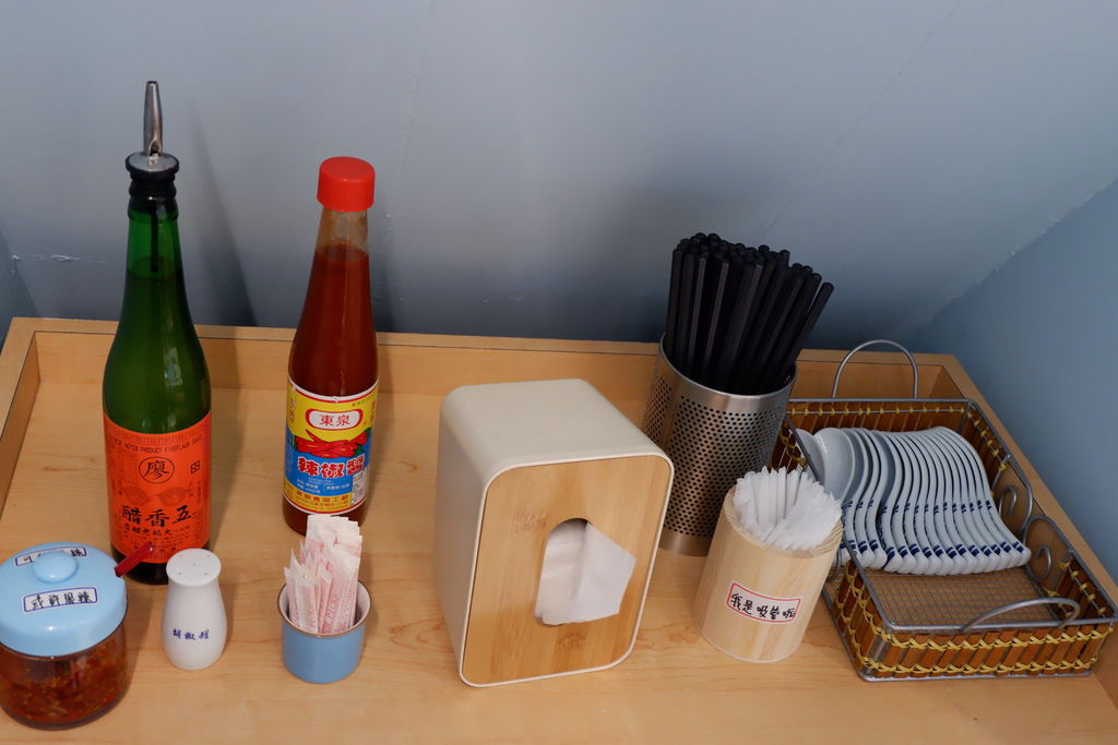台中人吃麵一定會加廖家出品的五香醋與東泉辣椒醬,吃夥拌麵加上這兩樣醬料就是天下無敵正宗道地台中味道的乾拌麵,餐具和衛生紙等都是自取自助式服務~~店內不收服務費非常佛心來著!
