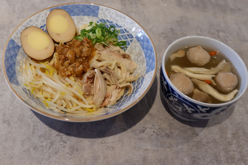 老闆不惜砸下重本,每天採購新鮮後雞腿肉並慢慢剁下切絲處理,淋上特熬肉燥和蔥花、切半的滷蛋、綠豆芽點綴擺盤,夥拌麵所選用的麵條更是成本要價不斐的手工製麵,經過多次挑選評比後挑出最滿意的手工麵條,麵條彈牙可口,Q彈有勁,真材實料且用心製作,服務態度親切用心,所有餐點也都用料上真材實料又好吃,最推薦麻辣雞絲乾拌麵還有美食家胡天蘭按讚過!美食家胡天蘭都有按讚過,可見得簡單的美食乾拌麵卻是讓人屢屢流連忘返,每次來必定要吃這一道,辣呼呼又餘韻無窮,料好實在,大碗滿意,湯是貢丸鮮菇湯,湯都是現點現做不能續湯,枸杞、杏鮑菇,3顆彈牙美味的貢丸與大骨湯熬成的好湯,用料用心實在,很適合在冷冷的冬天飲用祛寒補身!