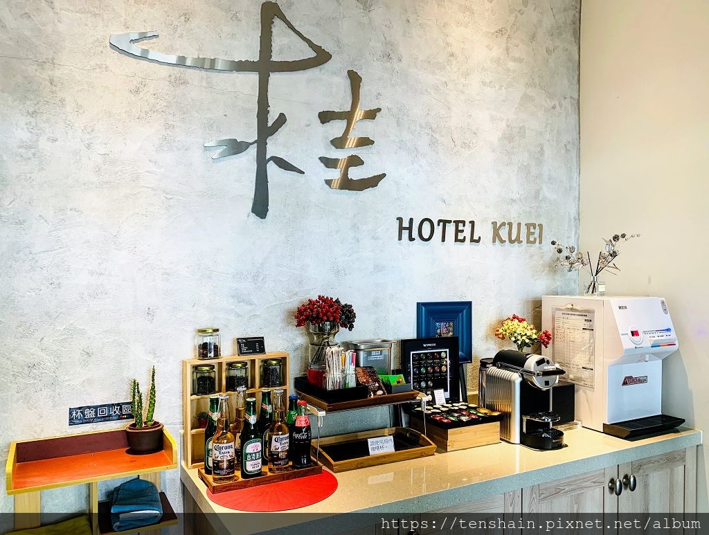 CHECK IN櫃台前還有一個小吧台,老闆很大方,膠囊咖啡隨你喝,但是杯子要從自己房間帶下來,真的有環保概念。左邊玻璃瓶裝的汽水和啤酒就不是免費的,但是價錢相當合理。