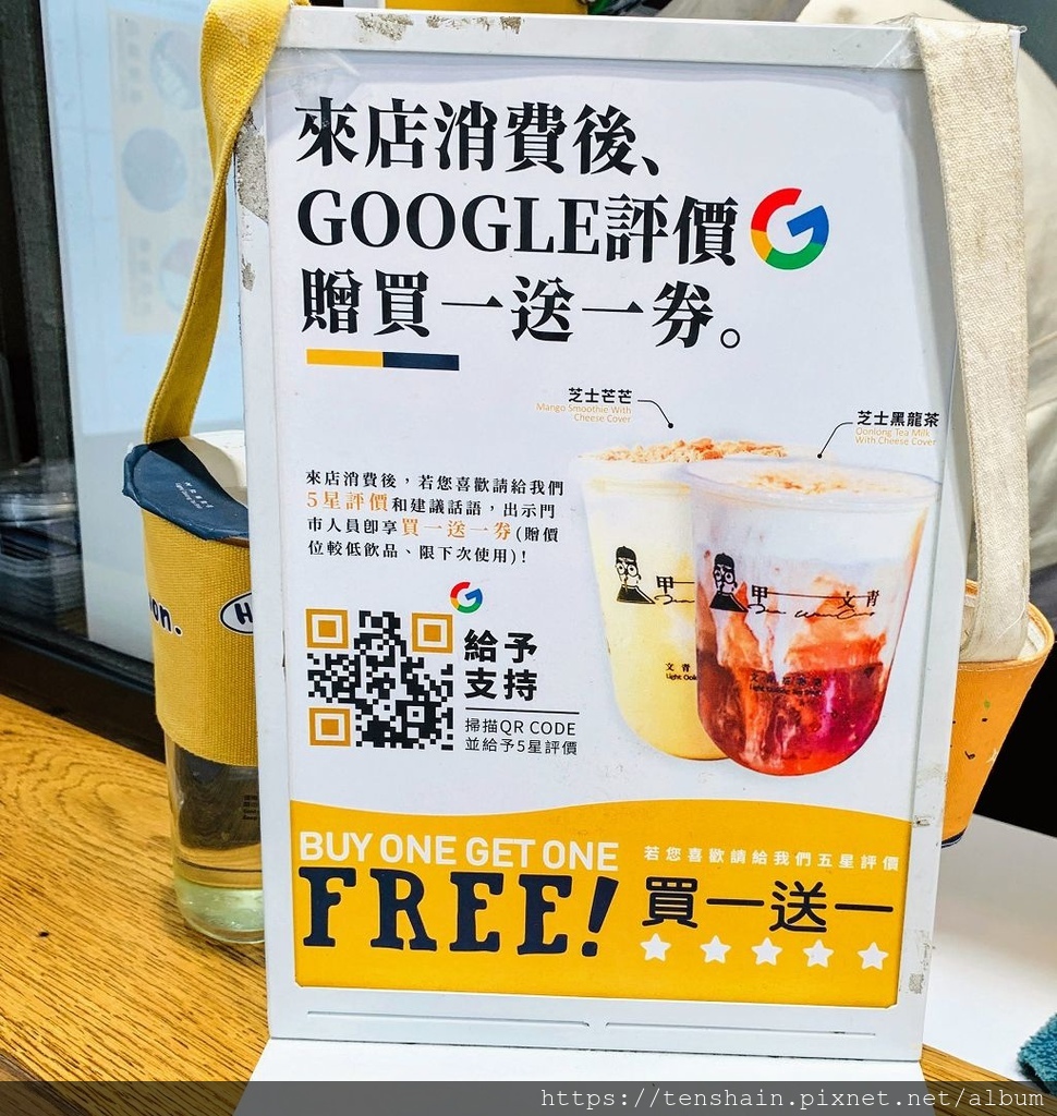 現在店家還有掃瞄QRCODE,給予五星評價就送買一送一券的活動。