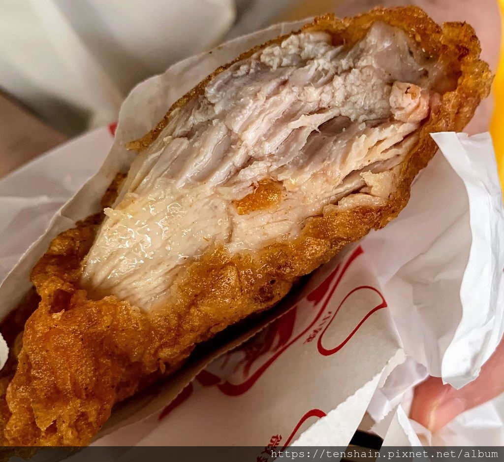 迫不及待的咬一大口,看看這雞肉的厚度,最厚的地方已經超過五公分,而且雖是雞胸肉,但每一口都是鮮嫩多汁且味道十足,表皮還是我最愛的酥脆麵衣,非常好吃!鹽酥菇軟嫩多汁,連香菇傘柄的部分也一樣,新鮮又好吃。