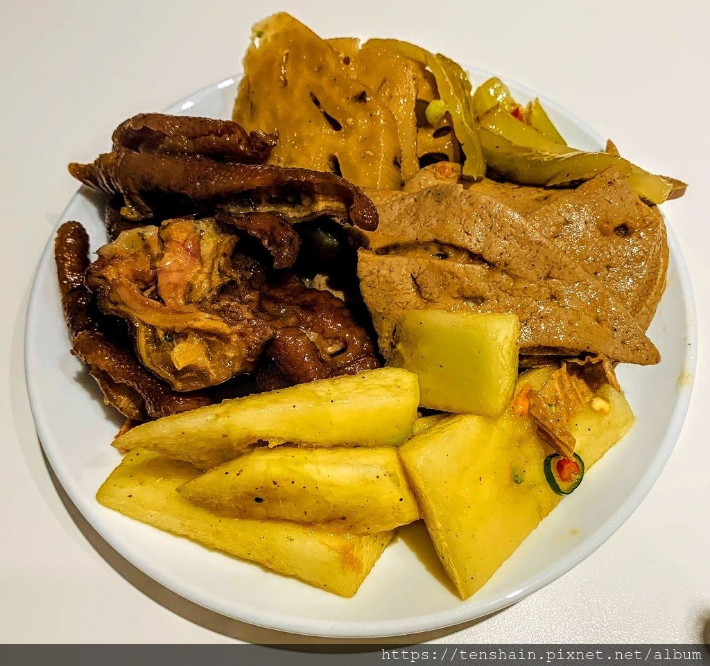 回到飯店,拿出盤子,倒出滷味,裝了滿滿的兩盤。其實我原本是比較不喜歡冷滷味的,但是吃了一口王記滷味的豆皮,立刻驚為天人!真的是汁多甘甜,好吃得不得了。花椰菜不只保留青翠的顏色,也很有味道。