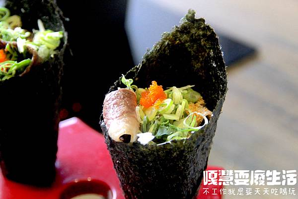 極致饌和牛手捲 脆皮的海苔包裹著舒爽脆口的生菜與鮮嫩的和牛,並用蝦卵點綴在上方,一口咬下和牛的油脂香氣馬上竄出來,與粒粒分明的蝦卵在嘴中融合在一起。
