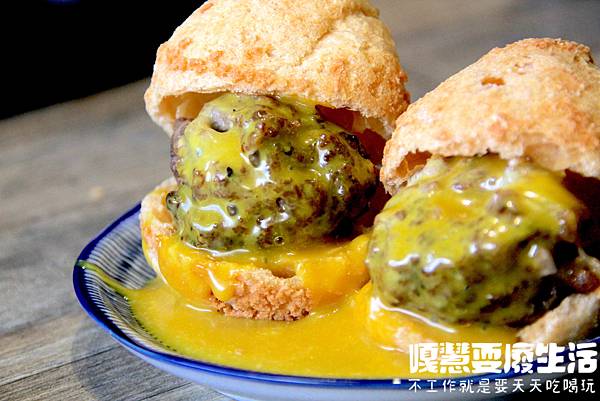 土石流和牛泡芙 是這裡的招牌菜之一,和牛肉製成的漢堡,和牛肉汁飽滿嫩口,跟橫濱和牛漢堡肉不相上下,讓人一口氣可以吃好幾個,搭配酥脆的泡芙與特製的起士醬,超順口,特製的起士醬微甜帶酸,完全不膩口而且經過調製不會覺得黏稠。