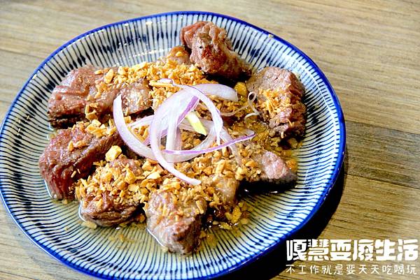 熱焰炙燒骰子和牛 是使用日式的製作方式,先將和牛表面炙燒並切塊浸入醬汁中,讓醬汁慢慢滲入和牛中,最後再次炙燒完成。將醬汁快速鎖在骰子和牛中,搭配蒜酥超對胃。一個人一下子就能吃掉一盤。