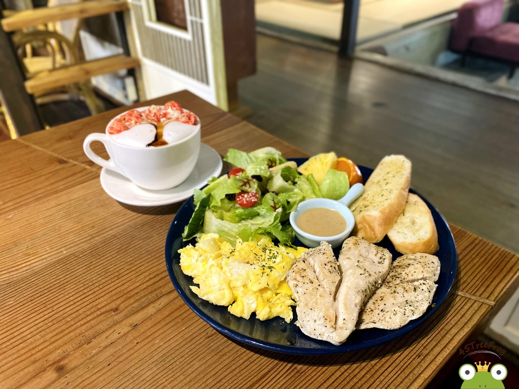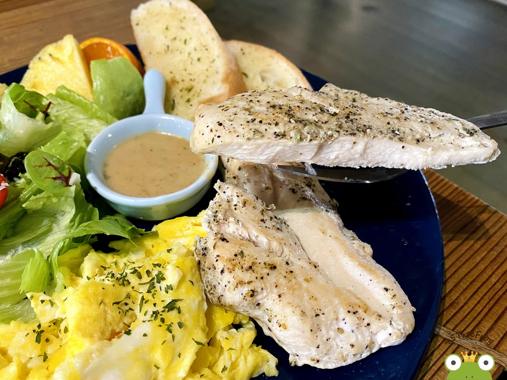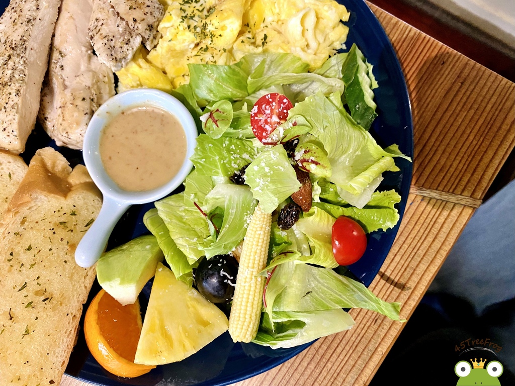 而這款慢活套餐是輕食類中最推薦的,本身有嫩煎雞胸肉、蒜味麵包、美式炒蛋、沙拉、水果。