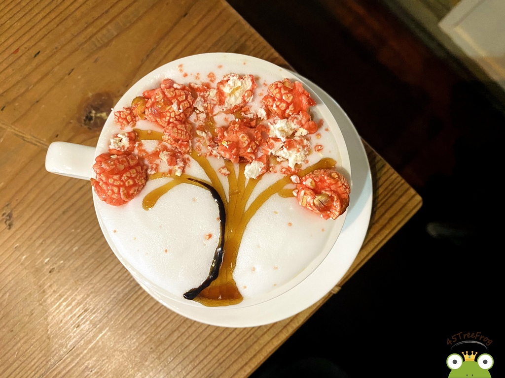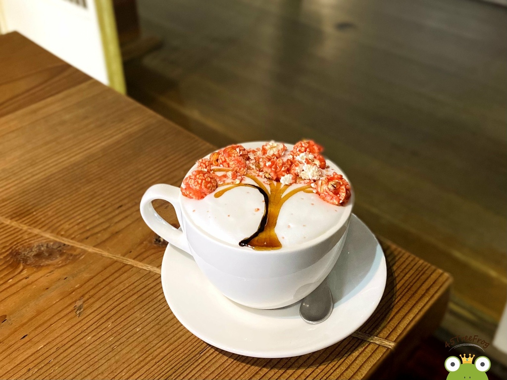基底是無糖拿鐵,喝得出咖啡豆用得很好,很香醇濃郁。而最上面把原本的拉花換做草莓爆米花+焦糖,畫成一棵櫻花樹,既夢幻又美觀。