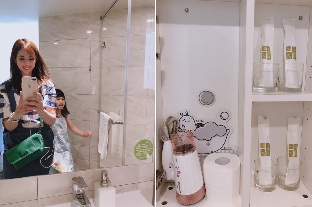 鏡子其實是個收納空間,吹風機、牙膏牙刷杯子都在裡頭。備用的衛生紙捲讓人感到貼心,曾經遇過幾次衛生紙沒了的窘境,對於我跟兩隻寶是過敏體質,哈啾連連的人,衛生紙沒了真的會心慌。由於是環保取向的旅館,所以若是需要浴帽、刮鬍刀、梳子之類的備品,可以直接向櫃檯索取唷。查最低房價/Agoda訂房