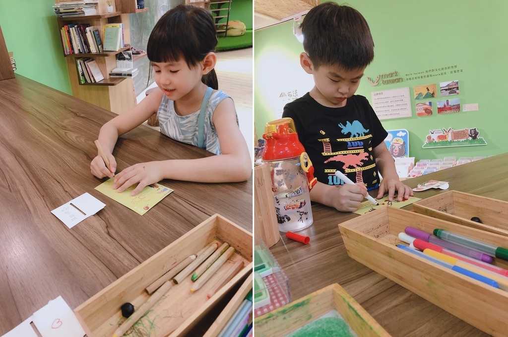 這區其實是『蝸牛日記』,有好幾本塗鴉本可以留言畫畫,寫下今日的旅行記事。不過我們是來這裡寫明信片的唷~ 兩隻寶說要寄給兩位阿嬤♥