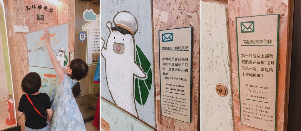 『森林郵便局』,有上下兩個郵筒,分別是寄給小蝸局長(每月抽出幸運兒回信並送小禮物)、寫給未來的自己(每年12月的第一週會寄出)。像我們是要寄給阿嬤的,其實不用投郵筒唷!直接拿到櫃檯就可以了~