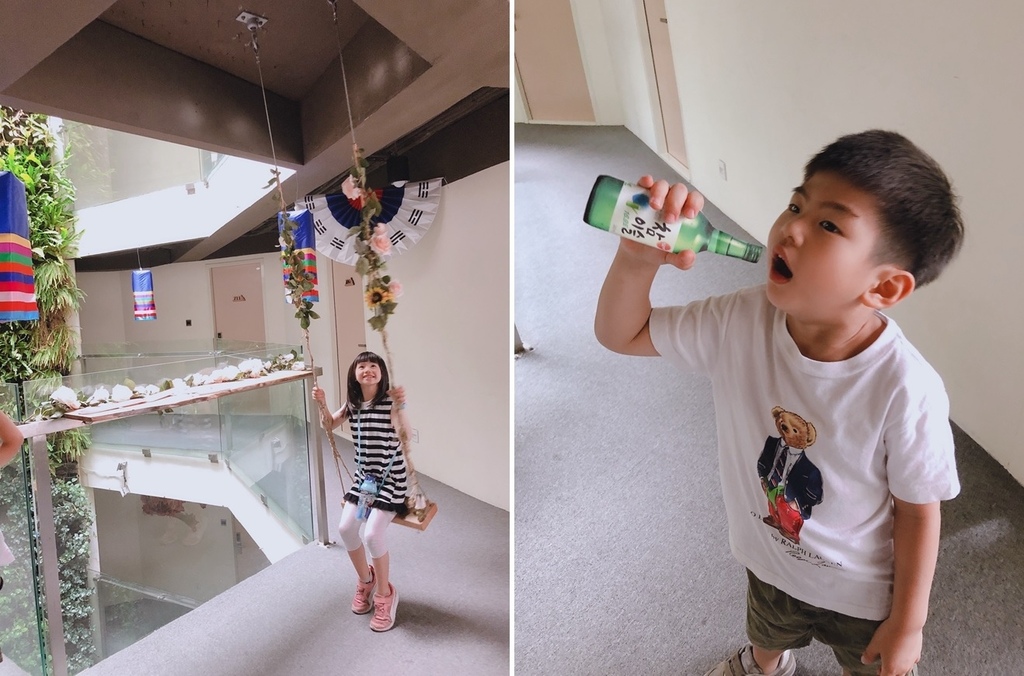 吼唷,我也想盪鞦韆啦,兩隻寶輪流盪,我只有在旁邊拍照跟幫忙推的功能XD 拍照打卡的道具也頗可愛~
