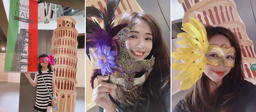 又稱為面具節的威尼斯嘉年華會,義大利文為Carnevale,是「世界三大嘉年華」之一唷。雖然地點是在威尼斯,跟比薩斜塔是離一段距離,不過威尼斯是水都,沒辦法變成拍照背板嘛~ 重點是拍面具就對啦!大概有10幾款面具在牆上,小孩大人都有唷:)