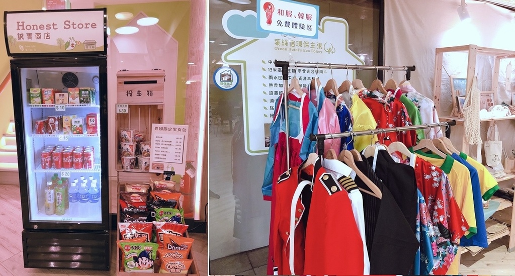 雖然走路就能到便利商店,但樓下就有誠實商店更方便呀~ 泡麵餅乾飲料通通有:) 配合偽出國主題,這兒還有一些主題服裝可以免費變裝唷!搭配不同樓層的國家主題,跟著Rikki 去拍美照囉~