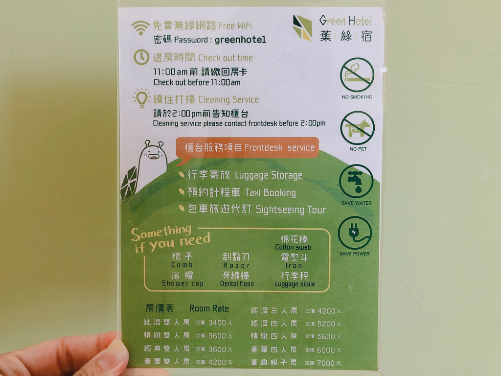 這篇文章寫超長,因為有太多豐富的內容想跟大家分享:) 文末就來看一下房內的說明立牌吧!葉綠宿Green Hotel是禁菸、禁寵物、希望旅客們都能節水節電。房內有免費的無線網路。退房時間是11:00,如果續住需要打掃要在14:00前告知櫃檯。櫃檯服務項目有行李寄放、預約計程車、包車旅遊代訂的服務,有些備品也可向櫃檯索取。 噢對了!如果帶著小小孩旅行,有需要床圍的話,訂房時也可以提前備註唷:)
