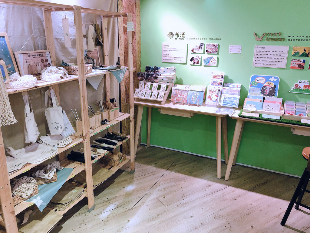 『無拘無塑』全是以環保為主軸的產品,飲料提袋、餐具組等等。右邊綠色牆面則是兩個台灣的文創設計品牌,結合台灣元素的產品,觀光客手刀買起來囉~