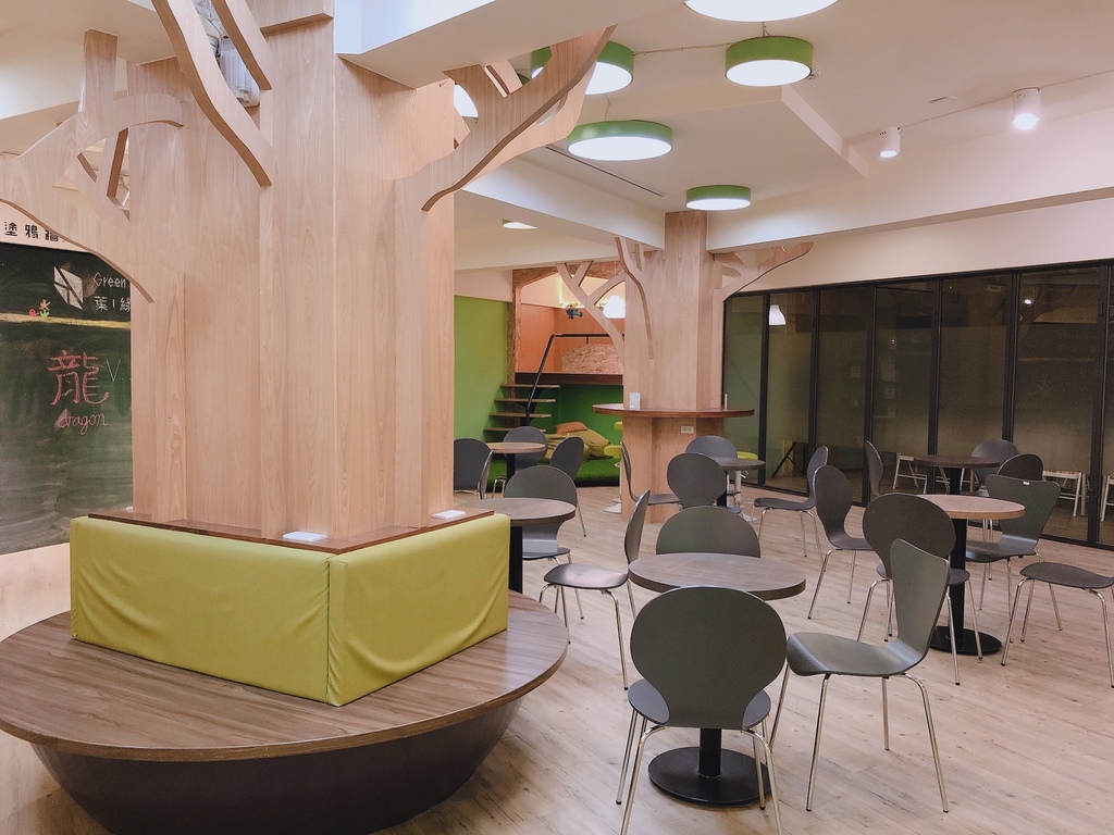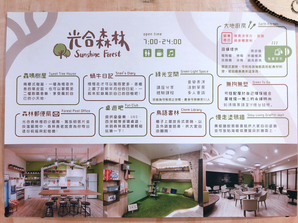 光合森林分為九大區,分別有『蟲鳴樹屋』、『蝸牛日記』、『綠光空間』(最多可容納50人)、『森林郵便局』、『桌遊吧』、『鳥語書林』、『慢走塗鴉牆』。還有設備超完善的『大地廚房』,以及推廣環保永續的『無拘無塑』。