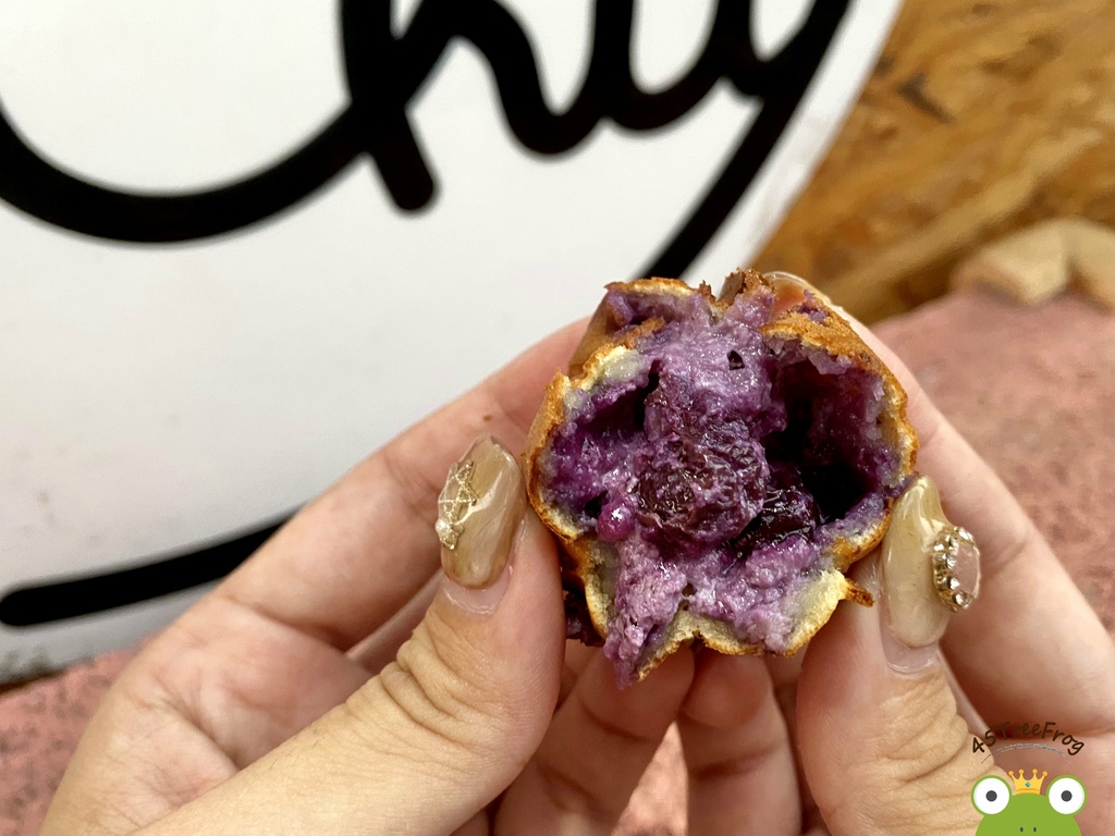 特別選購好市多的科克蘭藍莓與藍莓乾,兩者都是全天然整顆新鮮藍莓製成,不含防腐劑及人工添加物。老闆娘先把藍莓與乳酪一起煮成醬,再包一顆藍莓乾增添口感,整體來說微酸微甜蠻獨特的,而且紫色顏色也很吸引人。