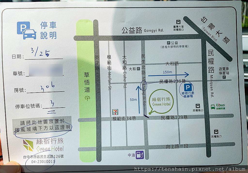 「綠宿行旅」的網路口碑很好,即使是平日,入住的旅客也很多,所以我們在訂房時,就特別商請飯店幫我們預留車位。入住當天,先把車開到飯店門口,下了行李,再跟櫃台拿停車場的地圖。地圖裡面有標示停車位號碼,這就是你住宿期間的專屬車位,即使開車出去逛,也不用怕回來時沒有車位可停。
