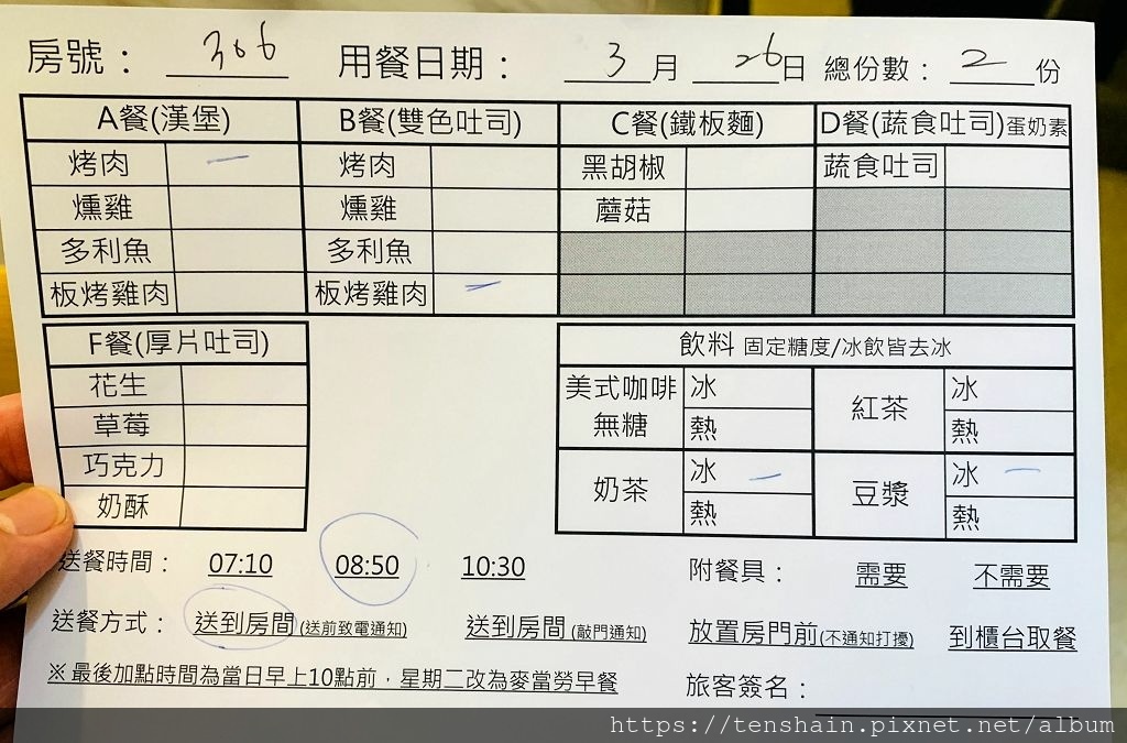 早餐的種類有五種,還可以選擇送餐時間、送餐方式,需不需要附餐具等。有一點要注意的是,為了確保送到您手中的早餐是熱的,所以餐點和送餐時間,決定之後若有變更,記得要在晚上 10 點之前,通知櫃台人員為您修改。