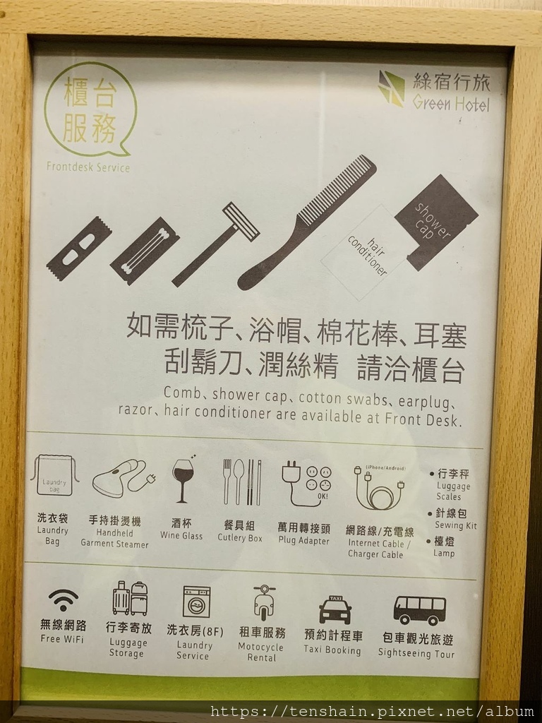 既然「綠宿行旅」是「環保旅店」,當然會鼓勵旅客自行攜帶個人盥洗用品,一同響應環保,所以房間內有些一次性備品不會主動供應。不過,如果你真的忘了帶,也不用擔心,可以向櫃台小姐索取。除此之外,還有很多東西可以借用,例如萬用轉接頭、網路線、充電線、餐具組...連手持掛燙機、酒杯都有,非常貼心!
