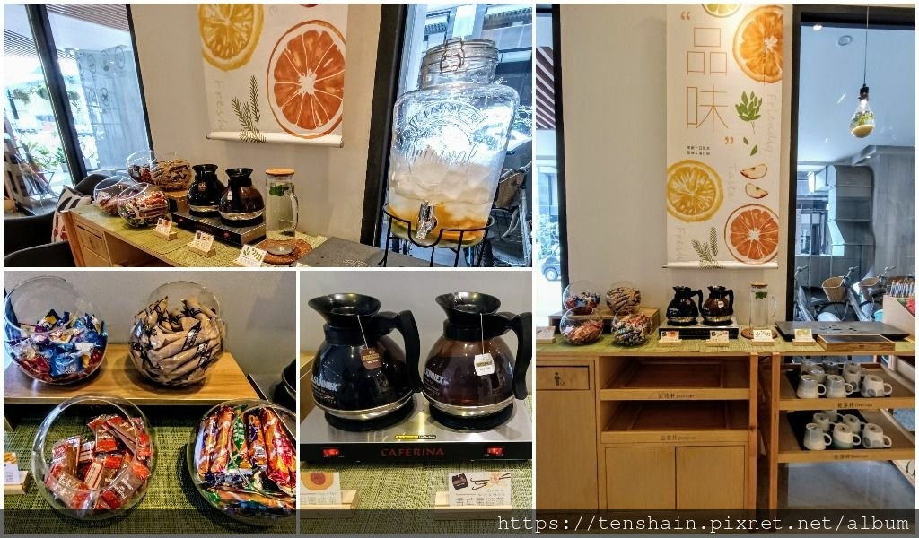 首先是「味覺之旅」,這一區我們可以品味貼心茶水和暖心小點心。小點心有餅乾、糖果;茶水有熱的香橙蜜桃茶、香草菊蜜茶,常溫香草植物水,還有冰的淡定檸檬水,其實這區就是一個 24 小時開放的點心吧。飯店人員表示,歡迎旅客將點心、茶水拿回房間享用,他們會隨時補充,不虞匱乏。
