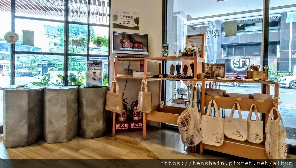 大門左側一角,這裡有幾本雜誌,有一台公用電腦,還有一些販售的環保產品。