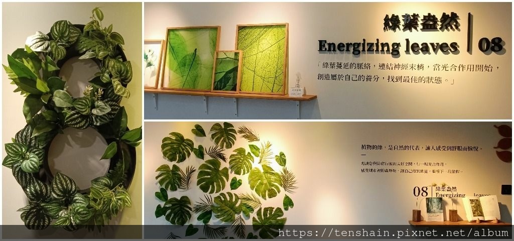 到了 8 樓,從電梯走出來,迎面就看到用綠葉編織成的 "8"字。往左轉,仔細看,牆壁上標示著 8 樓的展示主題是"綠葉盎然"。