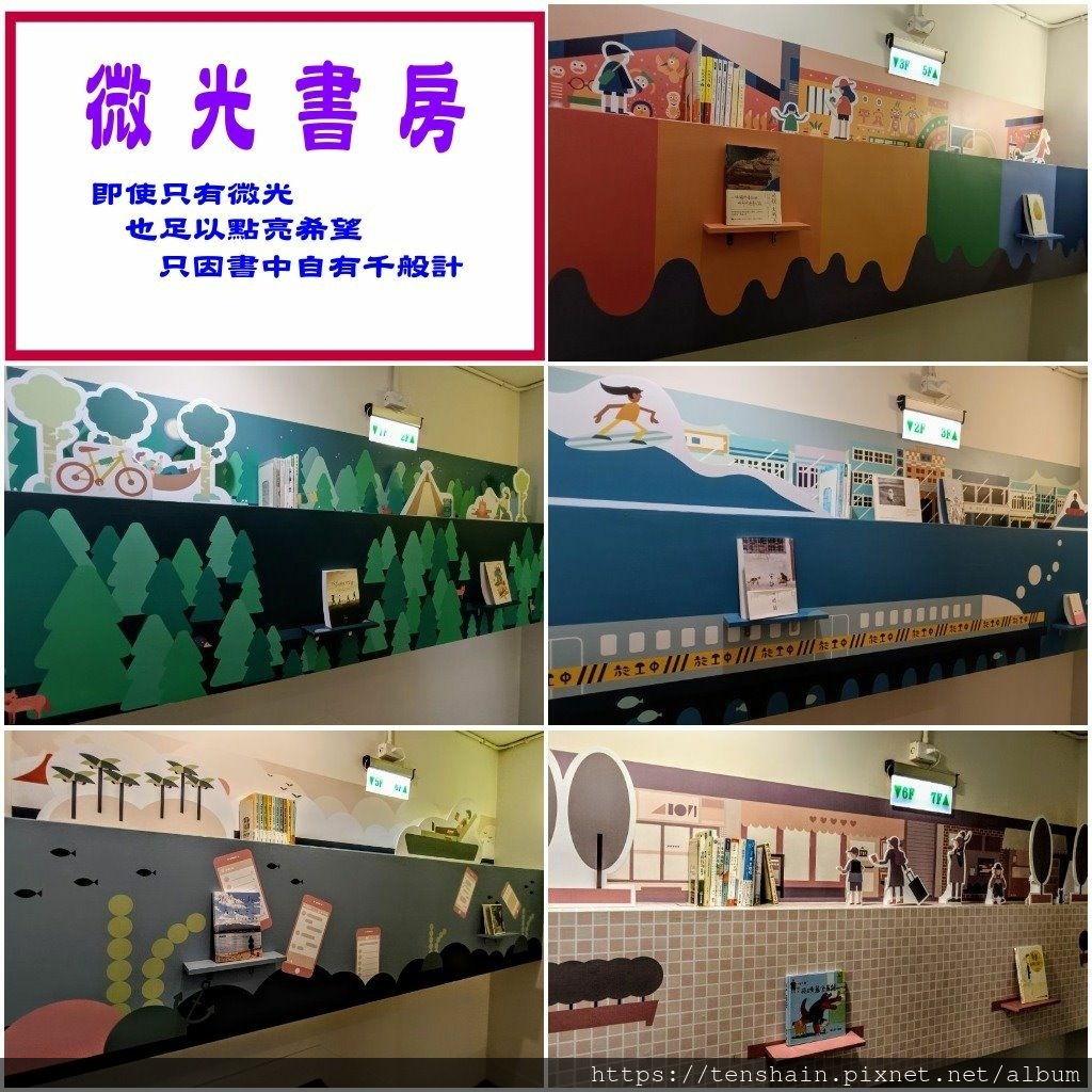 如果你以為「綠宿行旅」的用心只在各樓層的展覽區,那就太小看他們了!其實這裡的樓梯間也別有洞天哦,這也是為什麼我們要先搭電梯上 8 樓,再從 8 樓一路往下參觀的原因。因為每一層樓梯間的轉角平台,都有一間小小的「微光書房」,值得慢慢品味。