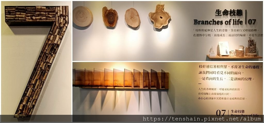 7 樓的展覽主題是「生命枝態」,看看這段文字:「枝幹連接著根與葉,承接著生命的過程,讓我們同時看到不同的面向,一是直向的生長,二是剖面的紋理。人生的各種風景,呼應著枝幹的形態,在時間軸上直線前進的同時,亦在心的剖面上沈澱堆疊出更成熟的思緒。」是不是很能發人深省?