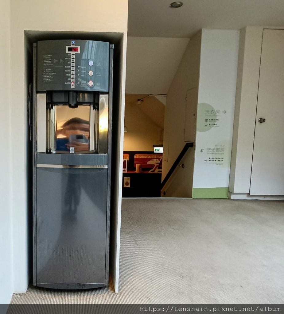 因為「綠宿行旅」不提供寶特瓶飲用水,所以每個樓層都備有冰、溫、熱三用飲水機。旅客可以拿著房間內的熱水壺,或是冷水瓶來裝水,既方便又環保。