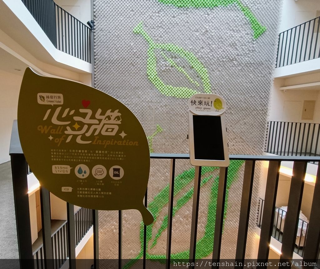 「綠宿行旅」秉持"生命永續發展"和"愛護地球"的企業理念,集團下的旅館於 2017 年起便不再提供寶特瓶飲用水,並與悅氏礦泉水攜手合作,回收 26000 個寶特瓶,組成 20 公尺高的「心之光牆」。這面「心之光牆」可不只是好看,還有全台獨創的室內煙火,利用平板裡的 APP ,就可以即時投射煙火與文字。不過,因晚上視覺效果較好,「心之光牆」的煙火秀只在 17:00 ~ 21:30 才能運作哦!