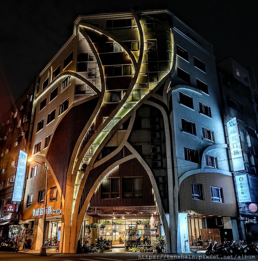 從三點入住,一樓一樓的在「綠宿行旅」裡漫步,我們體會了「味覺、嗅覺、觸覺、視覺、聽覺、心覺」六感滿足的完整旅程。此時夜幕已低垂,我們走出戶外,準備去尋覓今晚的晚餐。走了幾步,回頭望去,燈光雕塑下的「綠宿行旅」,不就是一棵矗立在都市中的生命之樹嗎?
