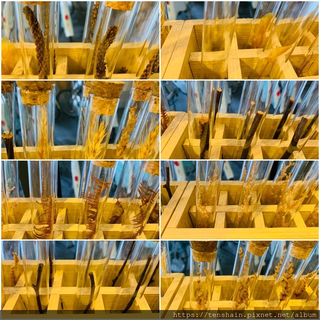 「視覺之旅」滿足了,「嗅覺之旅」就在水草燈下等著我們。聞香台上總共蒐集了十種不同的芳香植物樣本:迷迭香、甜橙、山雞椒、廣藿香、檸檬香茅、快樂鼠尾草、薄荷、佛手柑、玫瑰天竺葵、薰衣草,每一種植物樣本都準備了 8 份,分裝在各個試管裡。