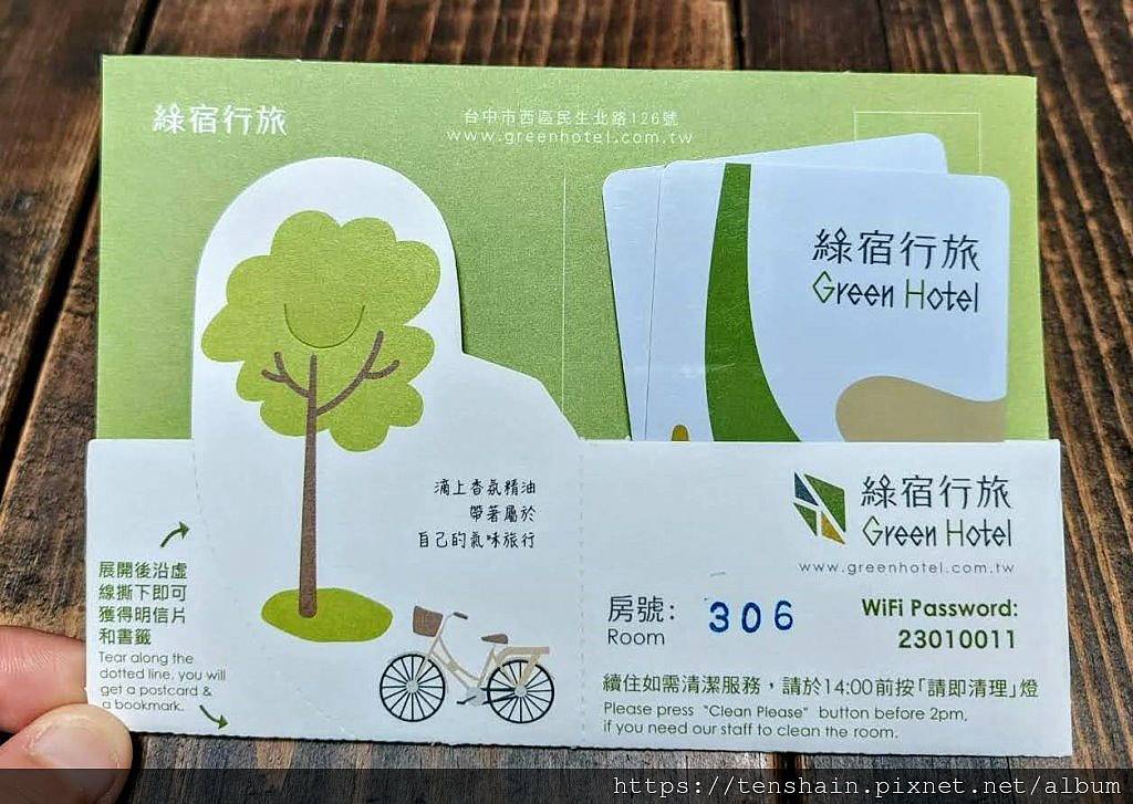 選好早餐,拿到房卡,CHECK IN 手續就完成了。「綠宿行旅」的房卡套設計得很有創意,一紙多用,沿著壓孔虛線,可以拆成三個部分。