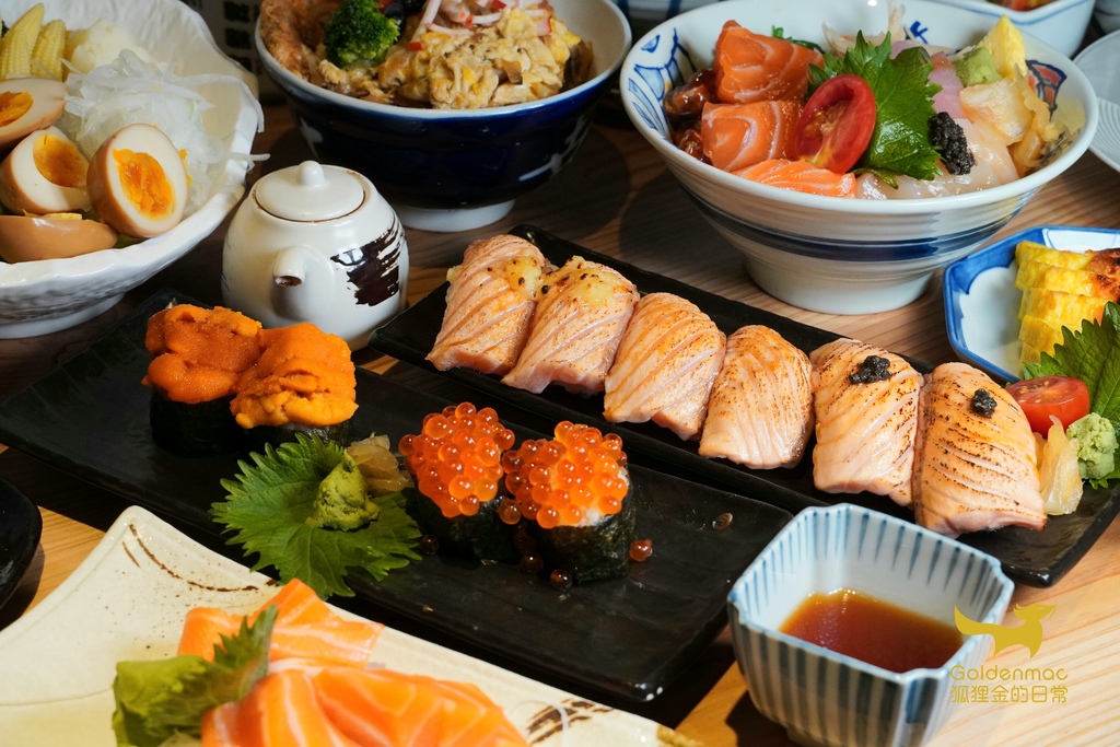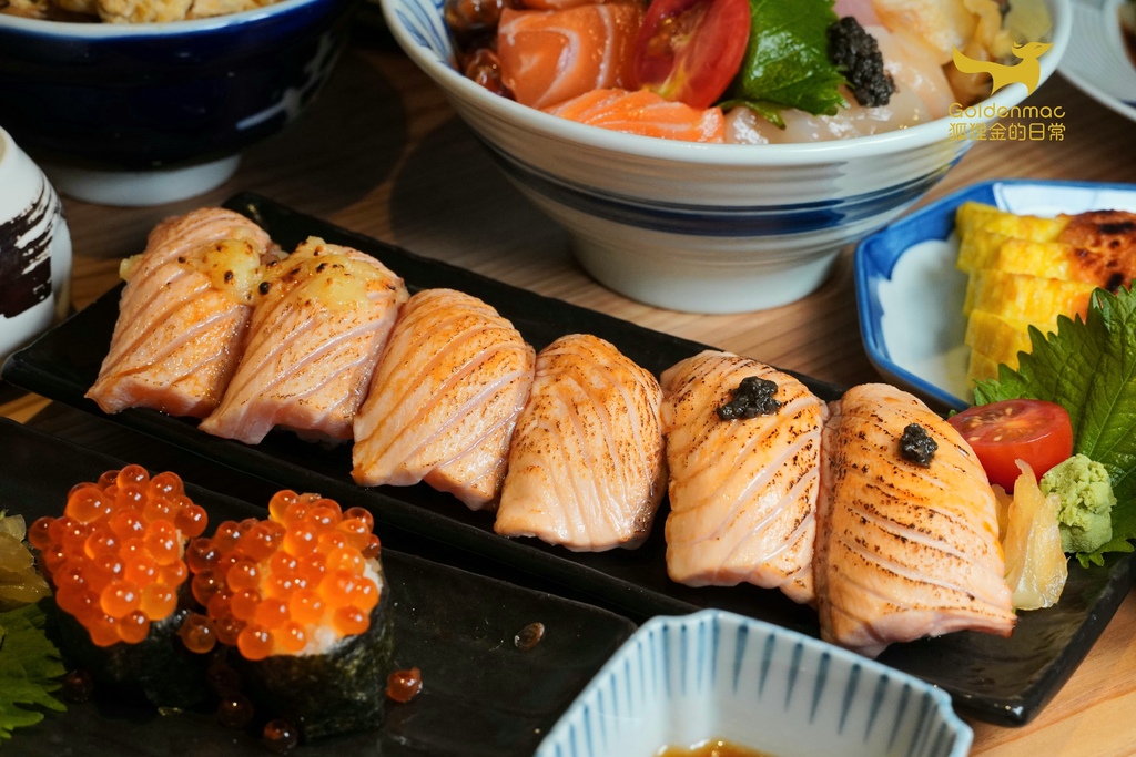 如果不敢吃全生食的朋友也沒問題,九屋太平の聚客所這綜合炙燒鮭魚握壽司絕對可以滿足你,每片鮭魚都切超厚超大片的,一次可以吃到原味炙燒、起司跟焦糖三種不同的風味,一次滿足。