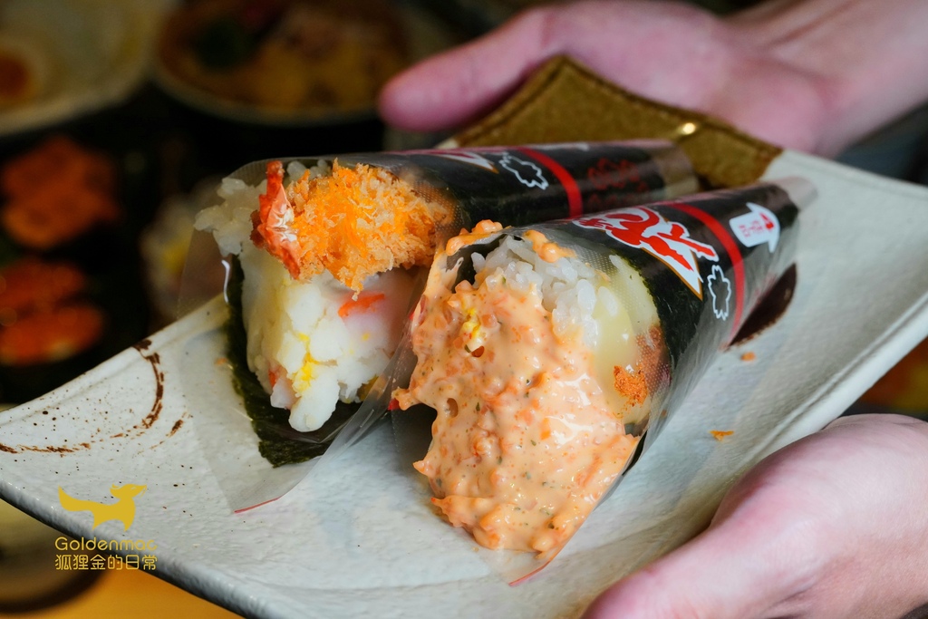 吃貨友人怕吃不飽,所以最後又外帶了手捲,九屋太平の聚客所這手捲裡頭除了有米飯外還加入了馬鈴薯泥增加風味與口感,這個兒頭真的不小,女孩兒吃一捲就可以很有飽足感。