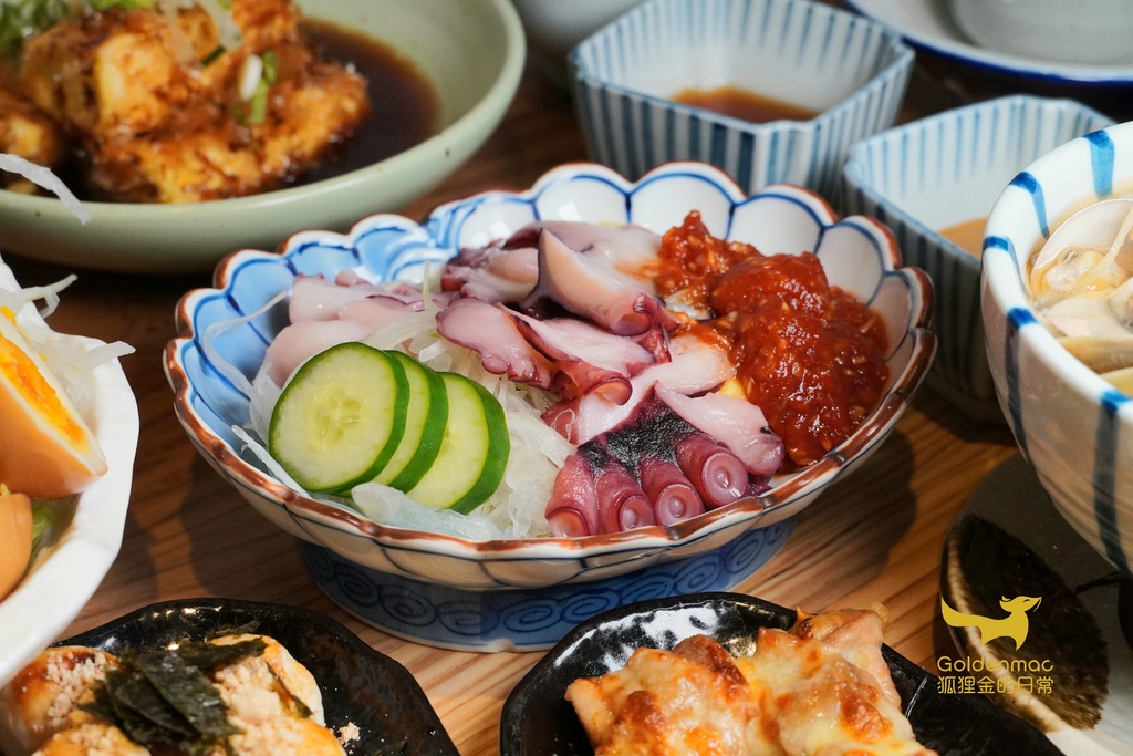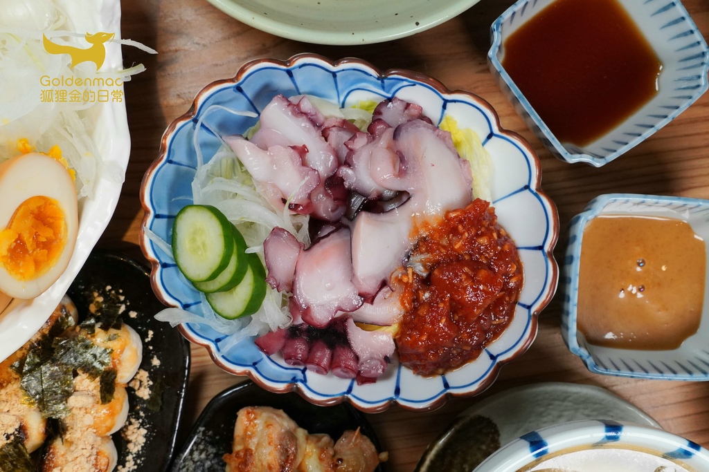 九屋太平の聚客所除了餐點CP值高之外,餐具也是選的都很不錯,搭配起來讓人更有食慾了,這五味章魚也是基本款必點的下酒好菜之一,再配上爽脆的黃瓜片跟洋蔥絲可以再來一盤,哈哈!