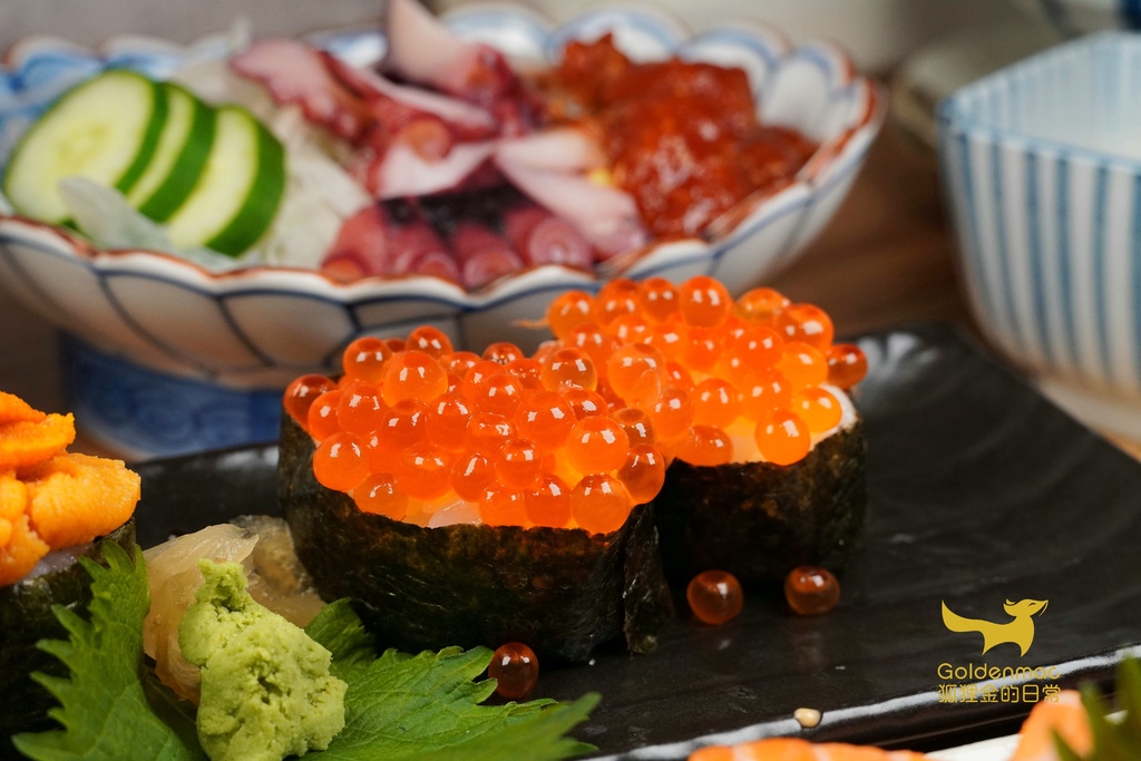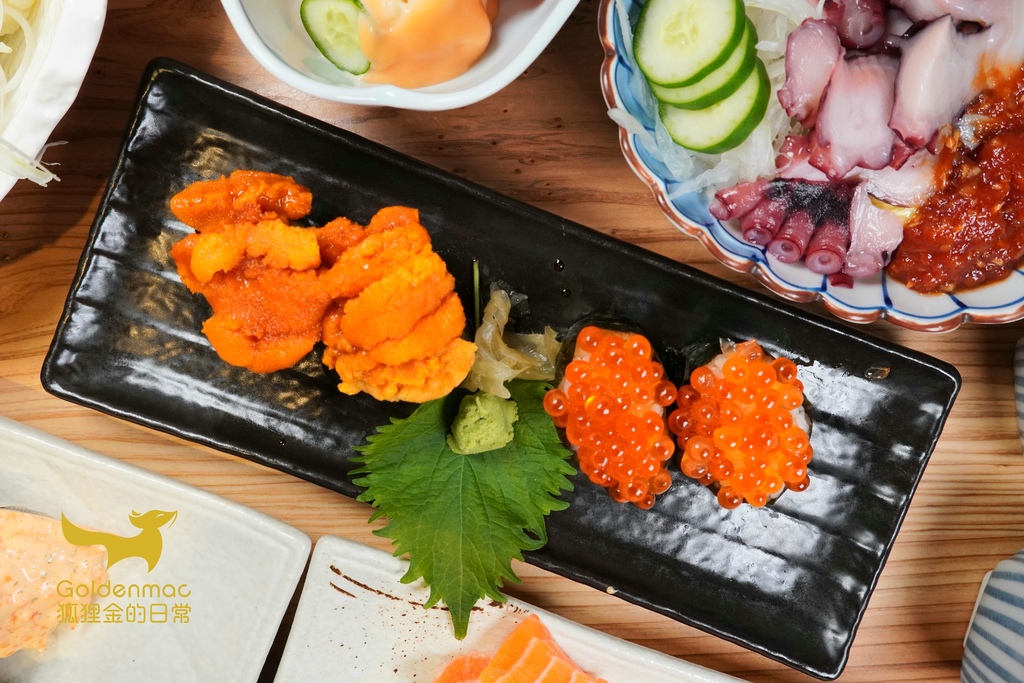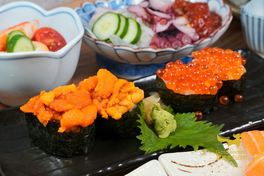 看看這舖了滿滿鮭魚卵跟海膽的握壽司> <畫面是不是太誘人,這兩款握壽司的鮮味真的不是蓋的,喜歡的朋友一定懂小金說的吧!