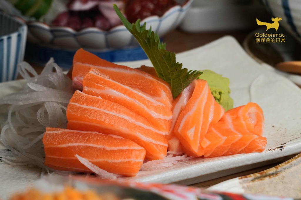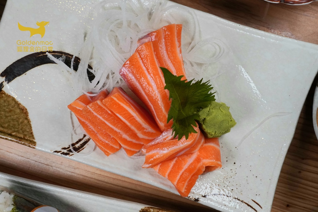 說到生魚片,鮭魚跟鮪魚兩種是小金的心頭好,特別是這油脂豐富的鮭魚生魚片更是讓人受不了,搭配清爽的蘿蔔絲沾點芥末超讚的!