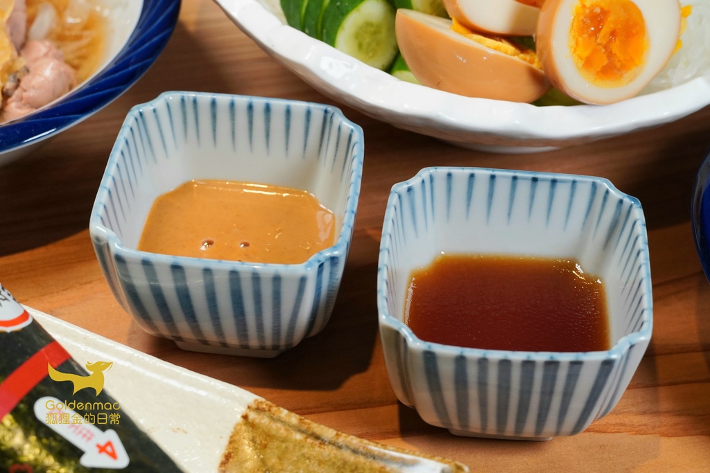 沙拉搭配的醬料有日式胡麻醬跟日式和風醬兩種,不管是搭香濃的胡麻還是爽口的和風醬都很不錯,做為開胃菜來說真的很不賴。