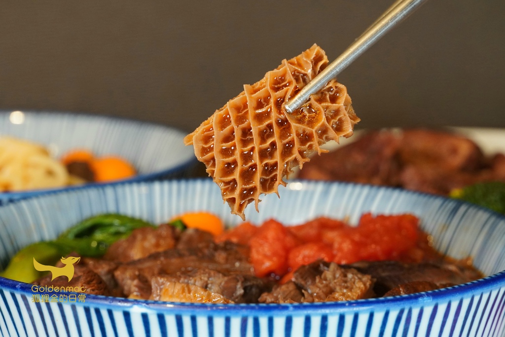 牛肉麵一上桌光是看這滿滿的牛肉塊跟牛肚跟誘人的色澤就真的胃口大開了吧!肉控來玖零牛肉麵一定要跟小金一樣點這加肉的吃起來超過癮的,再配上QQQ的厚切牛肚,真的是幸福感爆表。