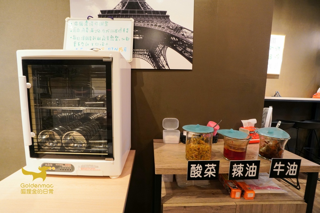 玖零牛肉麵餐具醬料在自助區這自個兒取用,他們家的酸菜是帶點香辣風味的小金個人很喜歡,加到麵裡一起吃真的很讚,另外還提供了又油又香的牛油,再加些牛油進去湯頭裡真的更有不同的風味層次。
