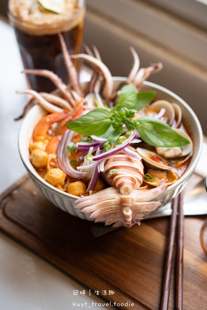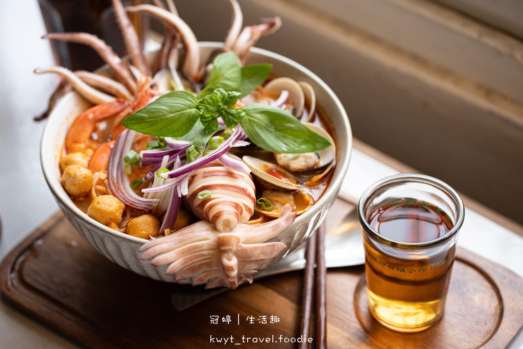 在精準控時控溫烹調完成的Q彈米線上排入鮮甜味十足、Q彈鮮蝦、肉質超飽滿的爆鮮蛤蜊、圓滾滾的黃金魚蛋、整尾存在感超高的極鮮~魷魚,最後再擺入紫洋蔥、蔥花、九層塔點綴,賞心悅目的高顏值現作暖食就在眼前。