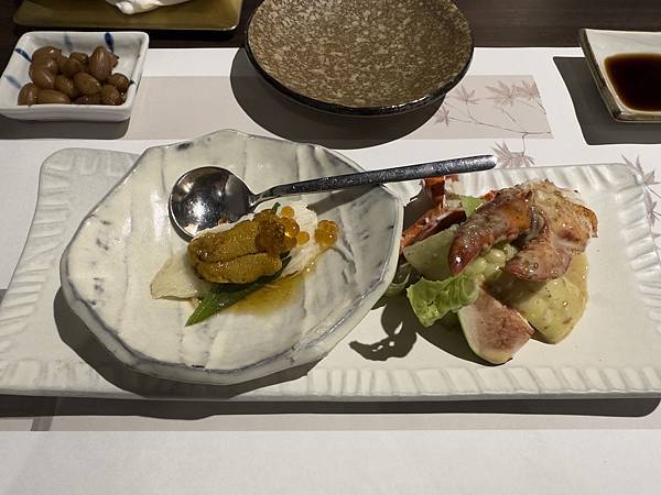 1. 海膽山藥佐鮭魚卵(左)、龍蝦肉搭配無花果及玉米佐千島醬(右)