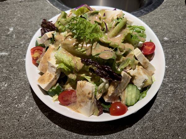 以蘿美生菜為主,搭配豆腐、小番茄、胡麻醬等,非常開胃,可惜有YC不喜歡的小黃瓜~~