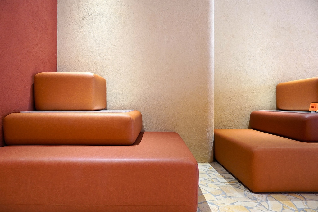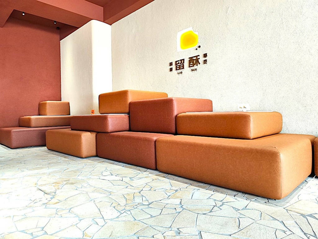留酥LIO SUU酥餅的空間是小金自己也有follow的「晴天見設計公司」設計的,從店外到店內都有許多的細節與巧思,店內這一個個堆起來的休息空間,坐在這聞著濃濃的酥餅香,就好像進入了酥餅王國裡一樣,哈哈!
